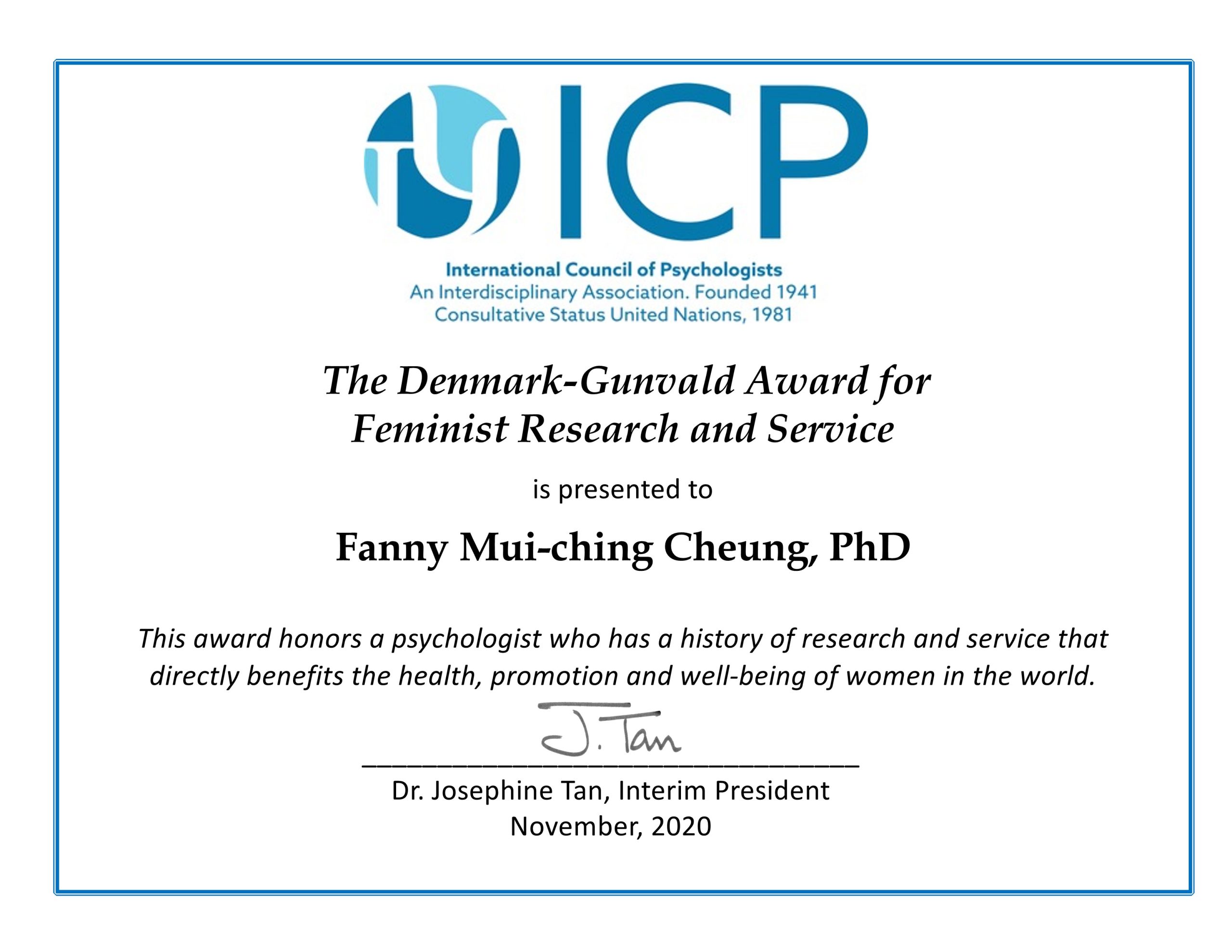 HKIAPS would like to share the good news that Prof. Fanny M. Cheung, our Senior Advisor of the Institute, has received the Denmark Gunvald Award from the International Council of Psychologists. This award honors a psychologist who has a history of research and service that directly benefits the health, promotion and well-being of women in the world.
