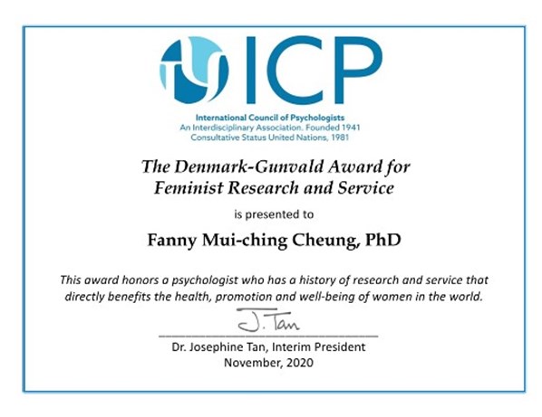 Congratulations to Prof. Fanny Cheung for receiving the Denmark Gunvald Award 2020