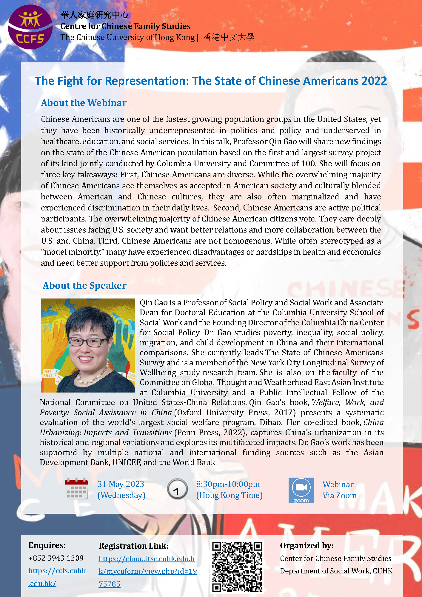 Chinese Americans are one of the fastest growing population groups in the United States, yet they have been historically underrepresented in politics and policy and underserved in healthcare, education, and social services. In this talk, Professor Qin Gao will share new findings on the state of the Chinese American population based on the first and largest survey project of its kind jointly conducted by Columbia University and Committee of 100. She will focus on three key takeaways: First, Chinese Americans are diverse. While the overwhelming majority of Chinese Americans see themselves as accepted in American society and culturally blended between American and Chinese cultures, they are also often marginalized and have experienced discrimination in their daily lives. Second, Chinese Americans are active political participants. The overwhelming majority of Chinese American citizens vote. They care deeply about issues facing U.S. society and want better relations and more collaboration between the U.S. and China. Third, Chinese Americans are not homogenous. While often stereotyped as a “model minority,” many have experienced disadvantages or hardships in health and economics and need better support from policies and services.